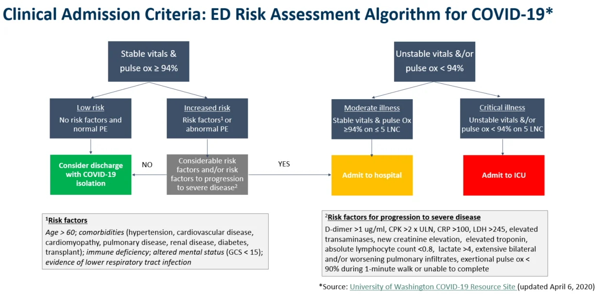 Generally, patients can be discharged from the ED if they are clinically stable, do not have any risk factors, are not at risk for progression to severe disease, and can be safely isolated at a low level of care. Patients who have oxygenation less than 94% on room air require hospitalization. And, if they have hemodynamic instability or need more than five liters of oxygen to maintain oxygenation above 94%, they are at high risk for rapid deterioration and are candidates for admission to ICU.
