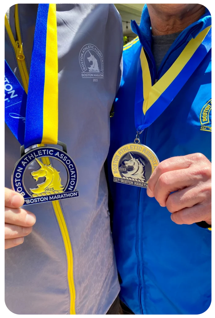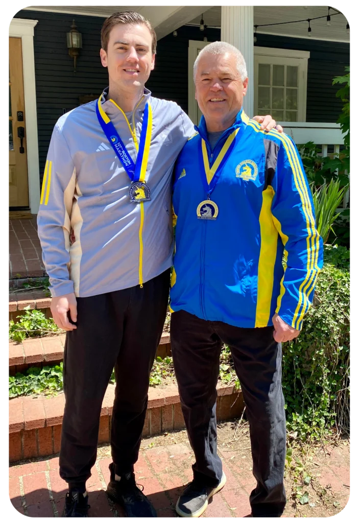 Bass celebrated with his whole family after receiving his medal and stylish new Boston Marathon jacket. His father brought his own medal and jacket achieved 10 years earlier — a full-circle moment for Bass’s marathoning journey.