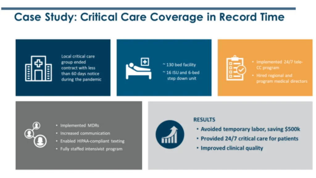 The pandemic underscored the need for alternative intensive care unit (ICU) programs and made plain the worsening shortage of intensivists nationwide. Throughout the world of telemedicine, the moment forced us to look at our existing models and reimagine something more flexible to help care for so many critically ill people.