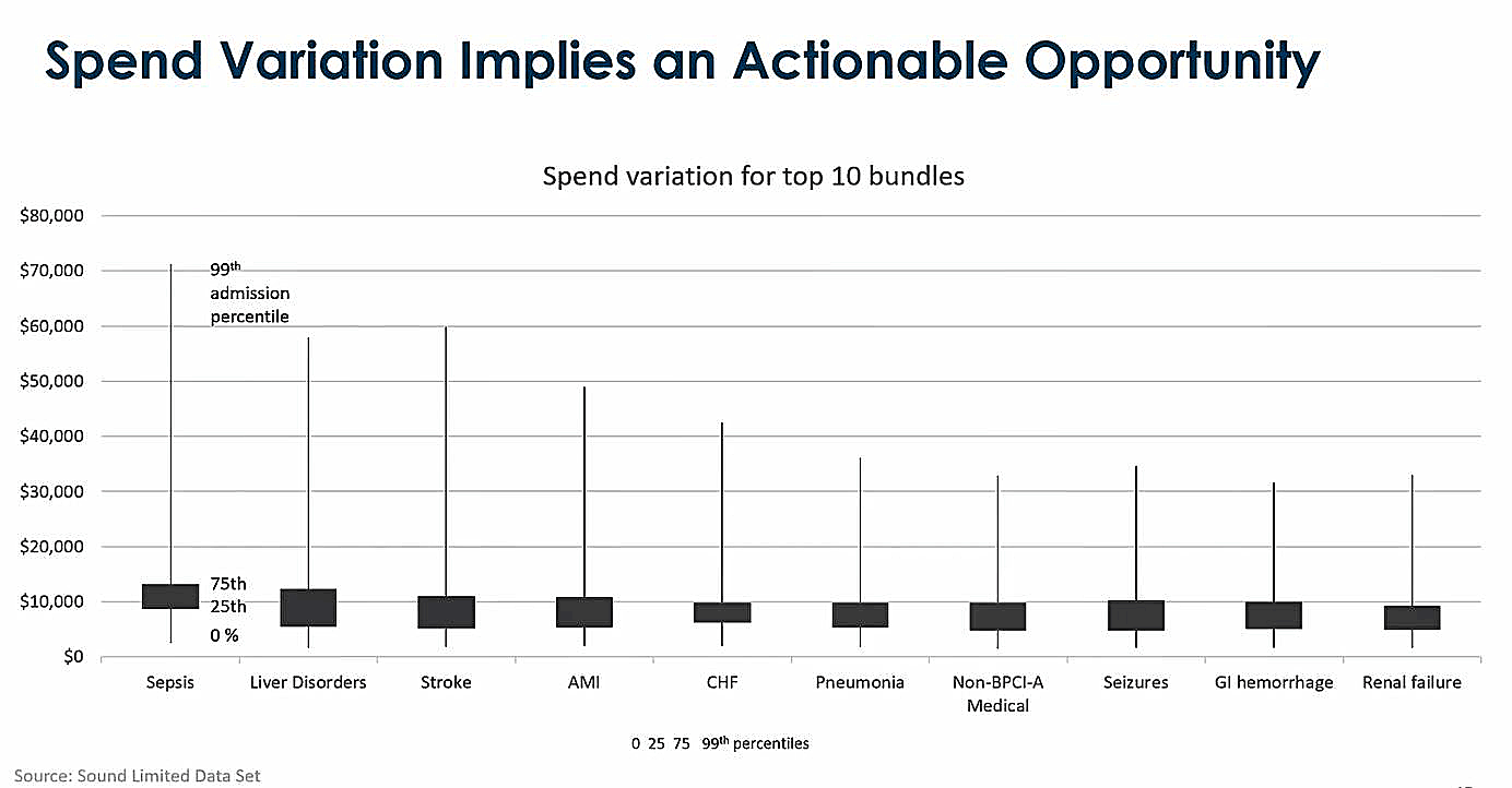 When we discuss variations in care and consider the top ten bundles of diseases, many of which diagnosis will end up in the ICU, it’s an easy insight to see a wide variation. The spend for sepsis per case, for example, can go from a few thousand to over $70,000 per admission, and what it implies is that there’s a tremendous opportunity to standardize how we treat these patients. There will always be a slight variation based on case details, but applying evidence-based care and standardizing the critical steps for each disease can help narrow that variation in spending and improve our ability to provide consistent quality.