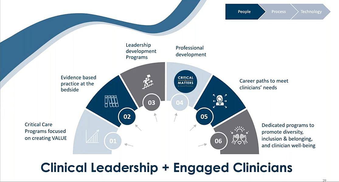 With the proper foundation in place, critical care leaders are poised to deploy value-based care interventions to improve ICU utilization, variations in clinical practice, and end-of-life care. At Sound, we have also found that it’s essential for intensivists to have the authority and accountability for bed triage. Also, clinical integration with the hospital and emergency medicine teams play an important part.