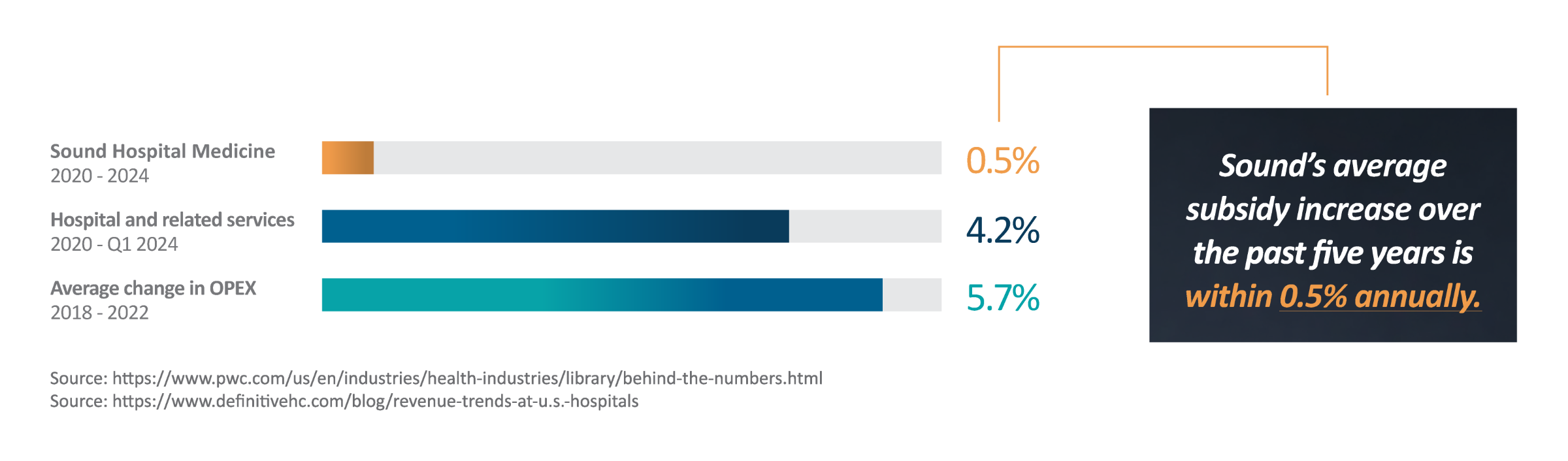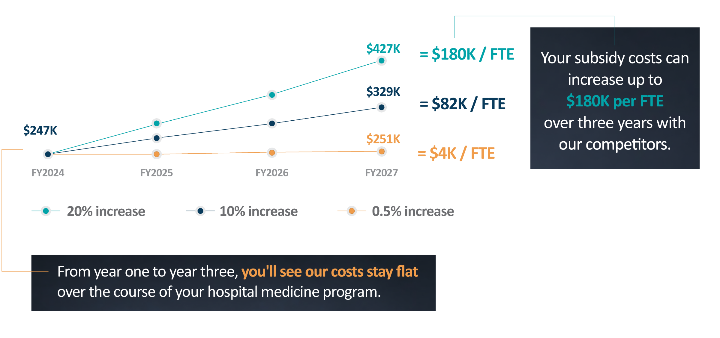 Our cost-consciousness and predictability are the result of our linear, leaner approach to building our practices. In our analysis of cost stability among our mature hospital medicine programs over the past five years, our average subsidy increase is within .5 percent annually. In comparison, industry indexes increase on average 4.2 percent to 5.7 percent.